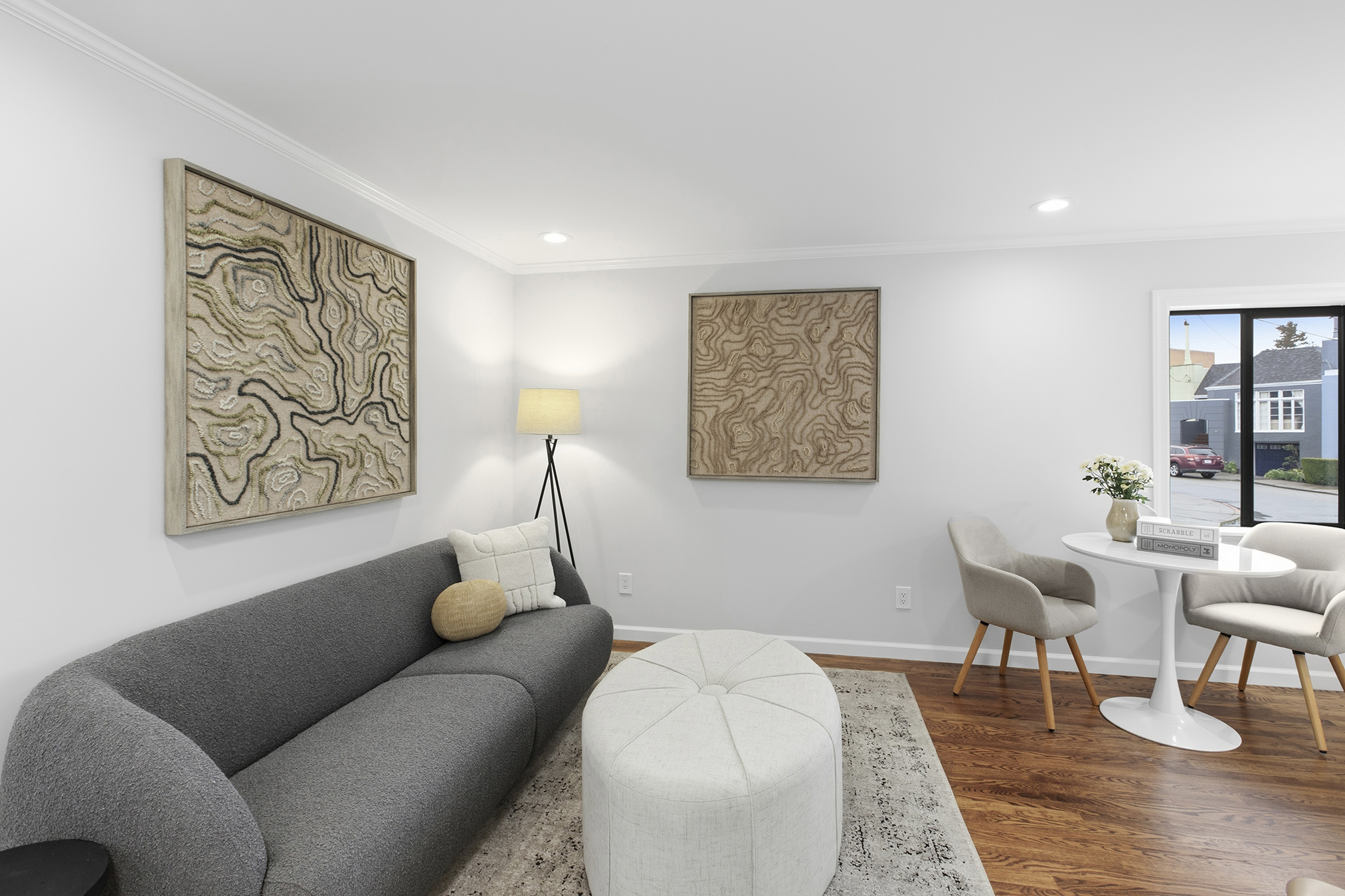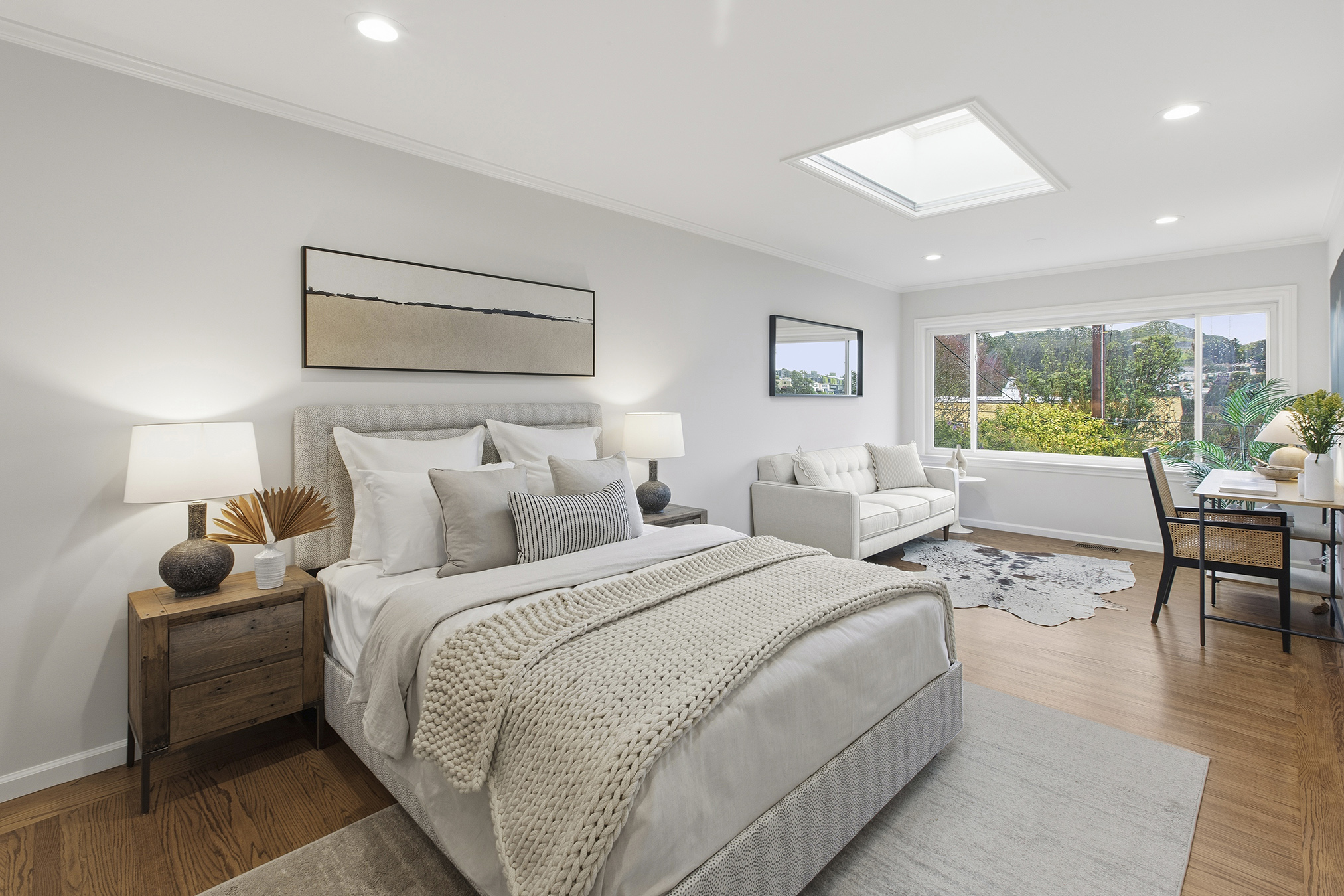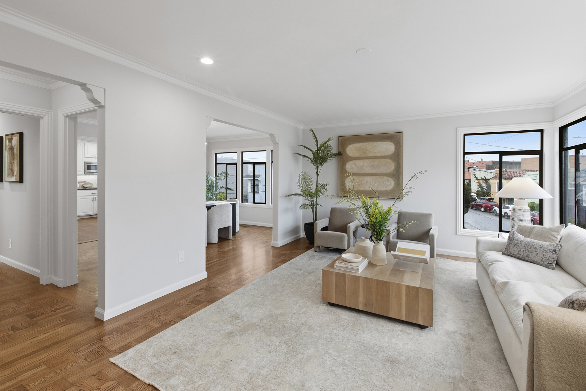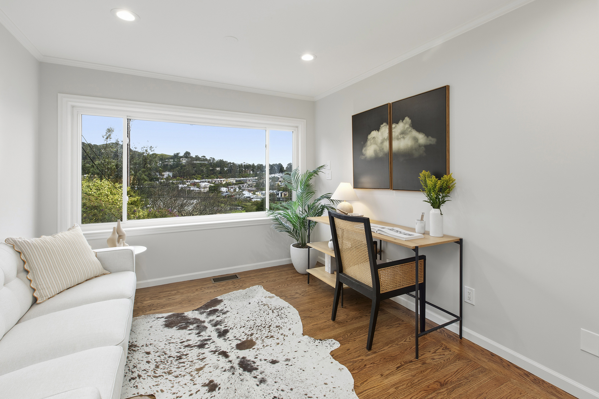 Spectacular, spacious, and semi-detached three-bedroom, two-bath meticulously maintained home showcasing a corner lot, stirring views, modern accents, and set in an ideal Miraloma Park location! The main level opens to a coveted open floor plan featuring a large living room with fireplace, inviting dining area, and an updated gourmet eat-in kitchen all with gorgeous wood floors and a wall of windows with cascading natural light. There are two bedrooms that both overlook the garden/patio/backyard and a full bathroom on this level. The conveniently located hallway leads to the comfortable lower level of the home with a large bedroom, entertainment room with wet-bar, a full bathroom, laundry room, wood floors, separate access, all graced with plenty of natural light and done with permits. The tranquil yard space with mature landscaping offers the perfect setting for peaceful repose, entertainment, or a gardener’s paradise. A large garage with plenty of room for storage completes this special home that is close to shopping, restaurants, cafes, public transportation, HWY 101/280 and more!