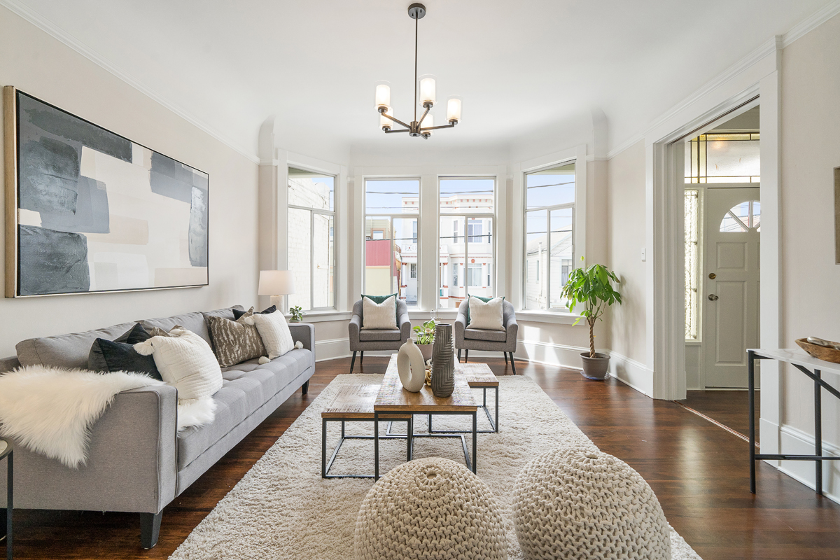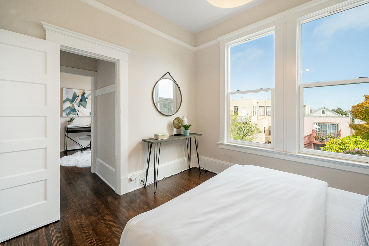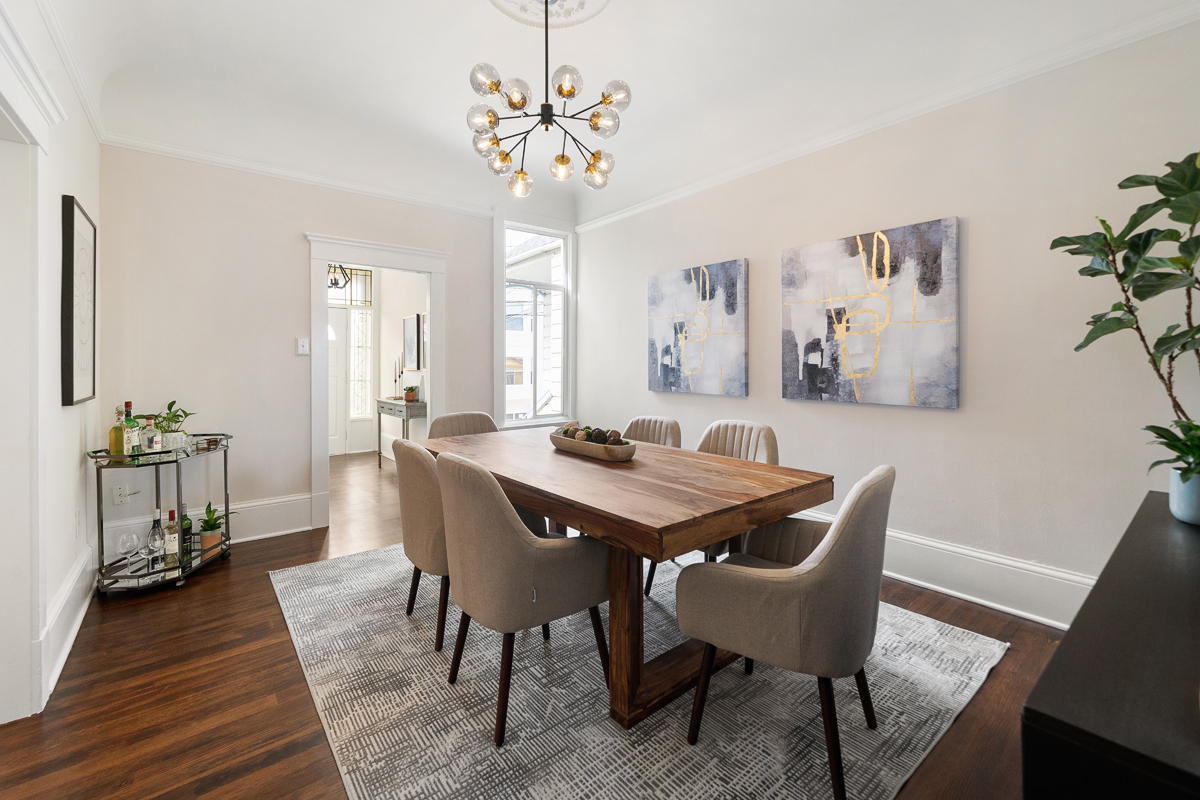 Spacious five bedroom, two and a half-bath home scented with period details, a stately façade and located on the border of two sensational neighborhoods: Mission Terrace and Excelsior! The classic formal entryway opens to gorgeous wood floors, a formal living room, dining room, a large eat-in kitchen, bathroom, three bedrooms, a half-bath and an office nook that looks out to the large flat backyard/garden. The lower-level living space with separate access offers a flexible floor plan featuring two additional bedrooms, a bathroom, and wet bar that leads to the backyard/garden/patio. The generous sized garage has additional storage areas and an additional parking space in front. Don’t miss the wonderful opportunity to own a home in a spectacular location that is close to parks, playgrounds, shops, cafes, restaurants, HWY 101/280 and more!