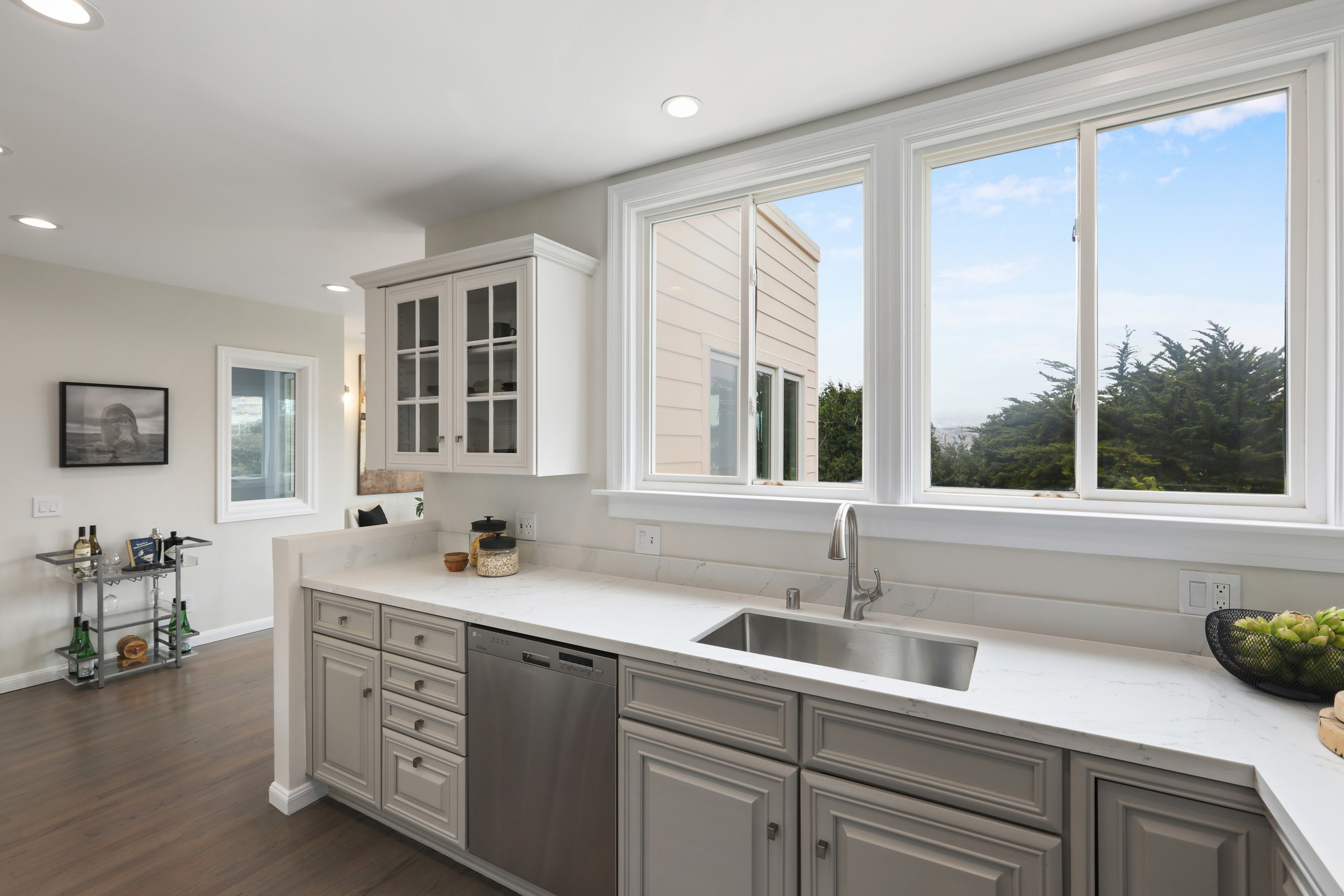 Impressive, inviting, and impeccably maintained three-bedroom, two-bath view home in a truly special Sunnyside location! The home opens to the winning combination of period charm and being tastefully updated with modern finishes, while providing a versatile floor plan. There is a formal living room, two spacious bedrooms, a remodeled bathroom with designer finishes and heated floors, a large and updated gourmet kitchen, and a glorious dining/entertainment area with spectacular views all on one level and all awash natural light. The lower level of the home has a private, additional bedroom with updated bathroom that overlooks the deck/patio and magical garden/backyard area. The home is on an oversized lot and the mature backyard is perfect for entertaining, gardening, and offers plenty of additional parking spaces. A large garage area with possible potential for future expansion and abundant storage space complete this home that is near shopping, cafes, restaurants, playgrounds, BART, HWY 101/280 and more!